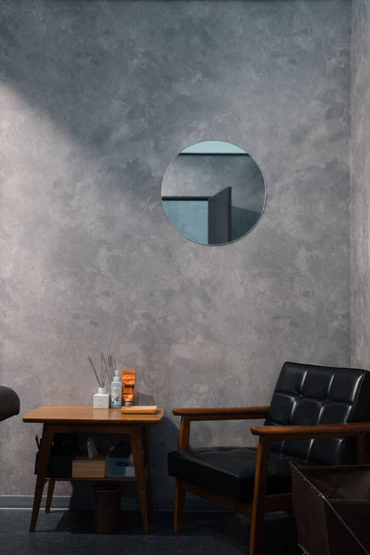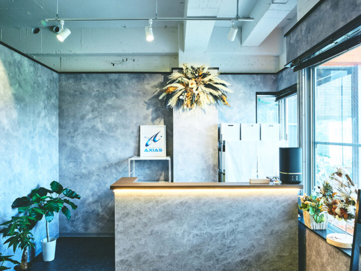 店舗の内装はグレーを基調とした洗練されたクールかつエレガントな空間をイメージしました。受付エリアは間接照明とドライフラワーの装飾で、落ち着きと温かみを兼ね備えた雰囲気を演出しています。トレーニングルームは最新のオールインワンのマシンを導入しております。