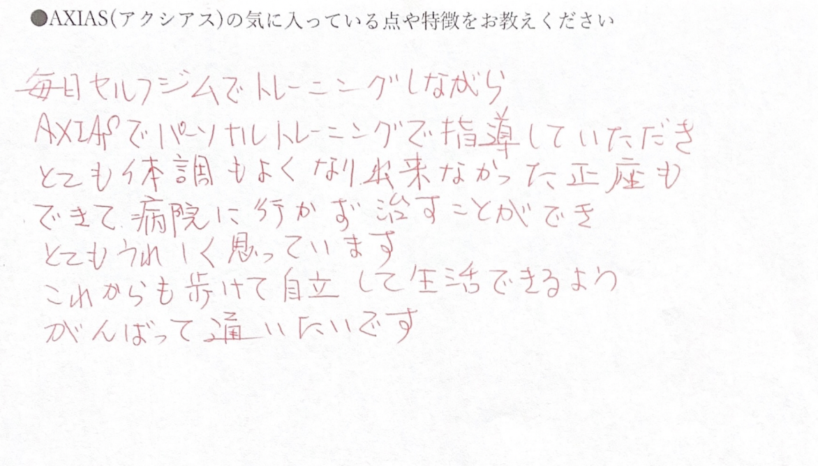 毎日セルフジムでトレーニングしながら、AXIASでパーソナルトレーニングで指導していただき、とても体調も良くなり、出来なかった正座も出来て病院に行かず治すことができとても嬉しく思っています。
