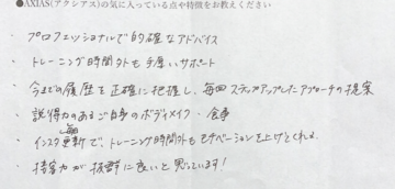 Personal Training Gym AXIAS(アクシアス)への口コミ「プロフェッショナルで的確なアドバイスをしてくれる」
